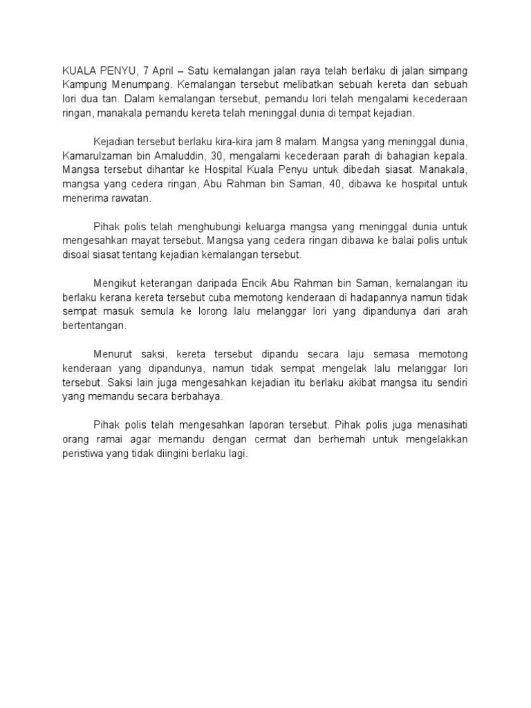 Contoh Karangan Tentang Berita Kemalangan Jalan 11 Racerabgi S Ownd