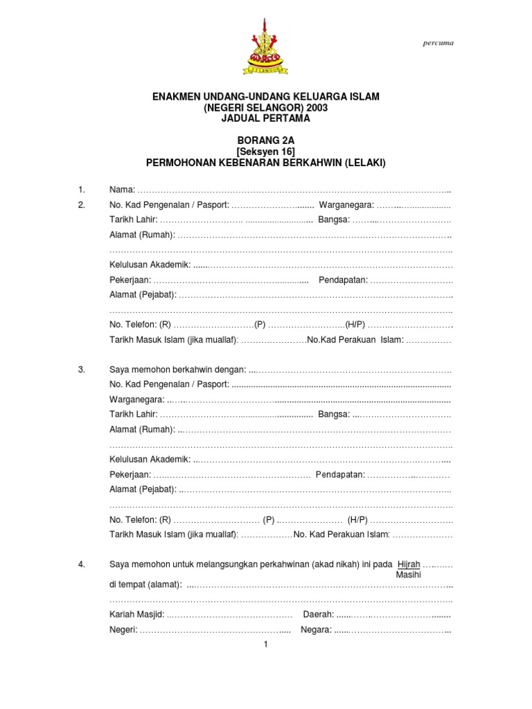 Enakmen Undang Undang Keluarga Islam Negeri Selangor 2003 Jadual Pertama Borang 2a Seksyen 16 Permohonan Kebenaran Berkahwin Lelaki