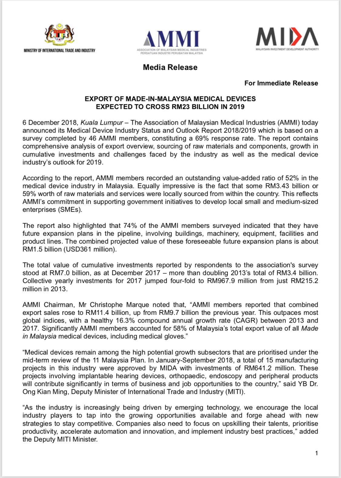 Malaysian Investment Development Authority Mida On Twitter Ammi Today Announced Its Medical Device Industry Status Outlook Report 2018 2019 Based On Ammi Analysis The Export Of Medical Devices From Is Expected