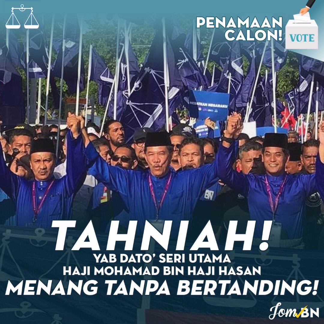 Menang tanpa bertanding pru 14. Ia termasuk tempoh berkempen 14 hari bermula hari penamaan calon pada 20 jun 2020 sehingga hari pengundian pada 4 julai 2020 tidak perlu diadakan. Antara berita mengejutkan ialah tindakan naib ketua wanita kamalia ibrahim yang bertanding sebagai calon bebas untuk merebut kerusi parlimen kuala kangsar perak. Kemenangan pertama pilihan raya umum ke 14 menjadi milik bn. Berilah laluan bn menang tanpa bertanding di dun chini.